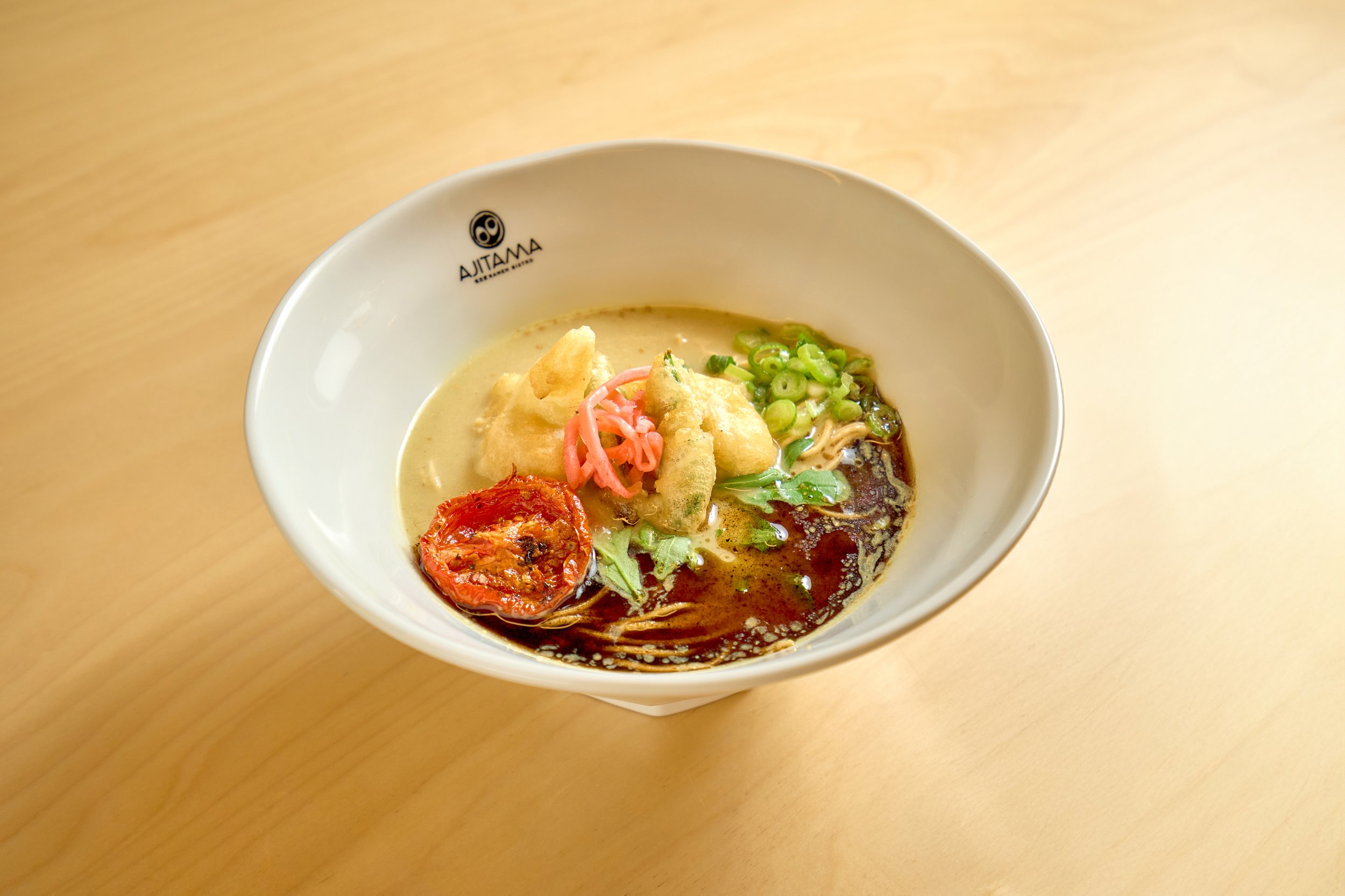 Caldo Profundo e cremoso de umami vegetal, acompanhado de tempura tradicional japonesa de couve-flor e feijão verde, beni shoga e negi, tomate assado e rucula.