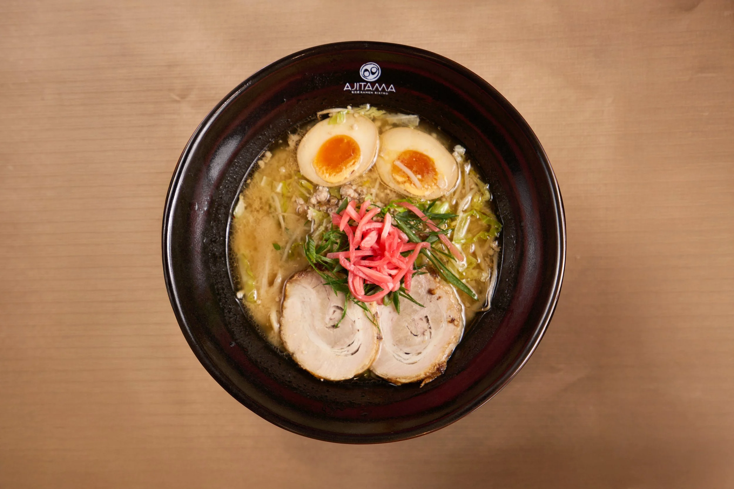 Caldo 7h Galinha com tare de 2 misos, com noodle grosso, ovo Ajitama, barriga de porco, rebentos de soja e carne picada.